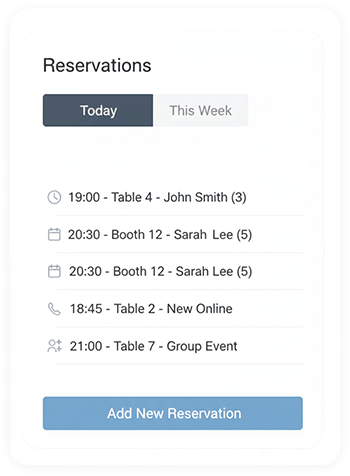 All channels feed into a single timeline and floor plan. Add phone bookings in seconds, avoid overlap, and see the whole shift at a glance.